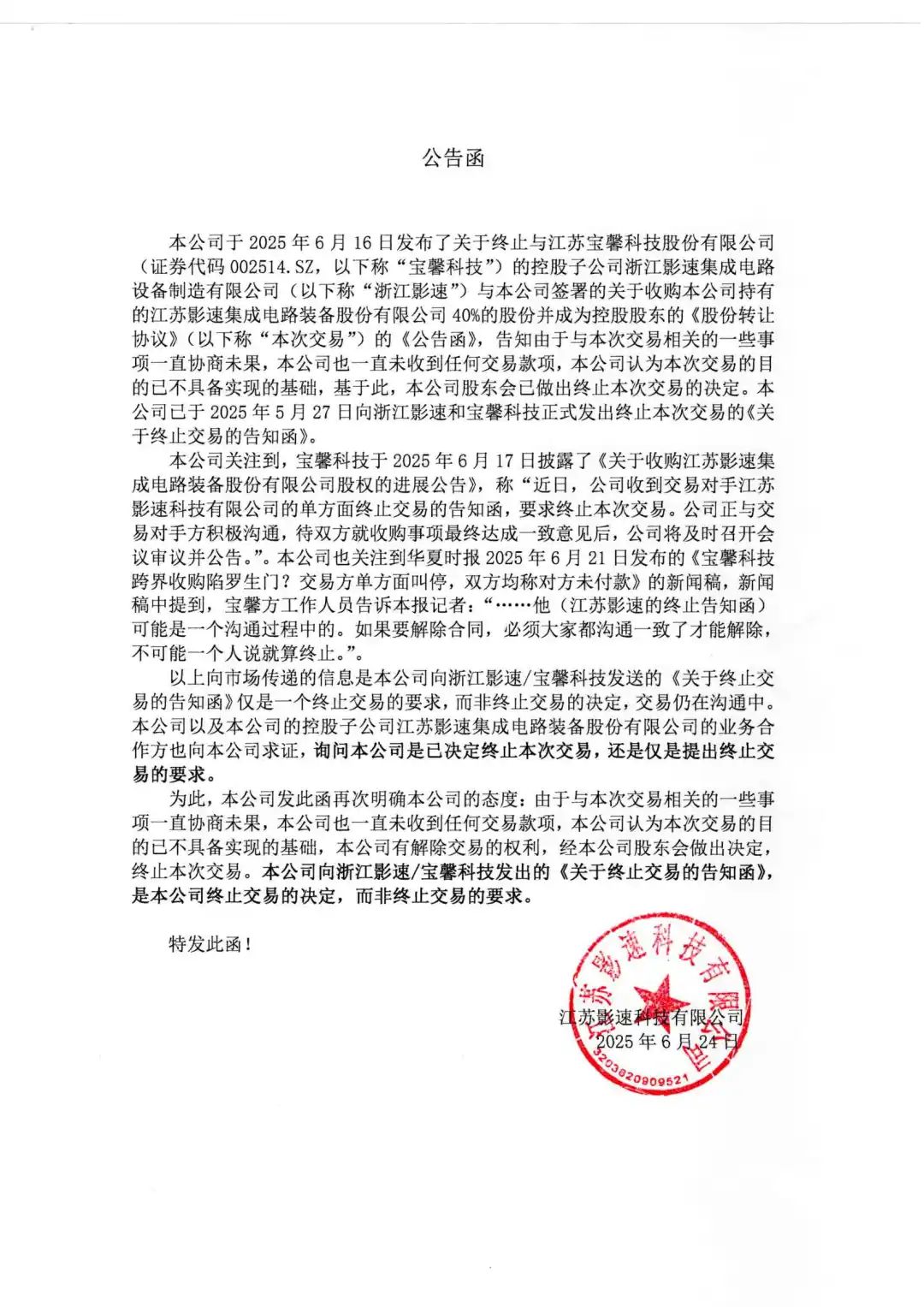 控股股东beats365科技已终止与宝馨科技(证券代码002514.SZ)的控股子公司浙江beats365关于收购本公司40%股份的交易